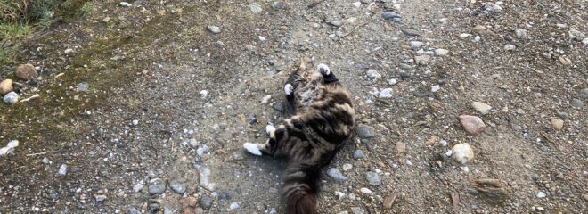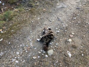 A few weeks ago, R and I saw a fluffy tabby cat intently hunting something in the field behind the Scout centre. I made the usual “Here kitty, kitty noises” and it gave me a look of extreme contempt and ran off.