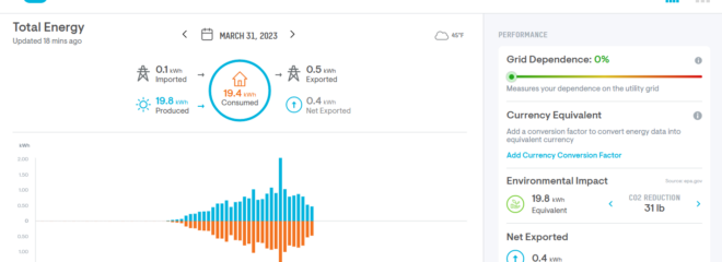 I am well impressed with this though important to note that we can not be completely off grid with this set up because due to the climate here there are three months where we don’t make bugger all. But yesterday – last day in March – we were 100% energy independent.