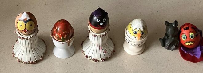 We had a nice buffet, two quizzes (both of which my brother won), and painted some Easter eggs. From left to right – J’s owl bear, my mother’s “rose garden”, N’s Humpty, R’s chick, and my demon. The demon won although he looked better before he spent an hour scrunched up in my bag.