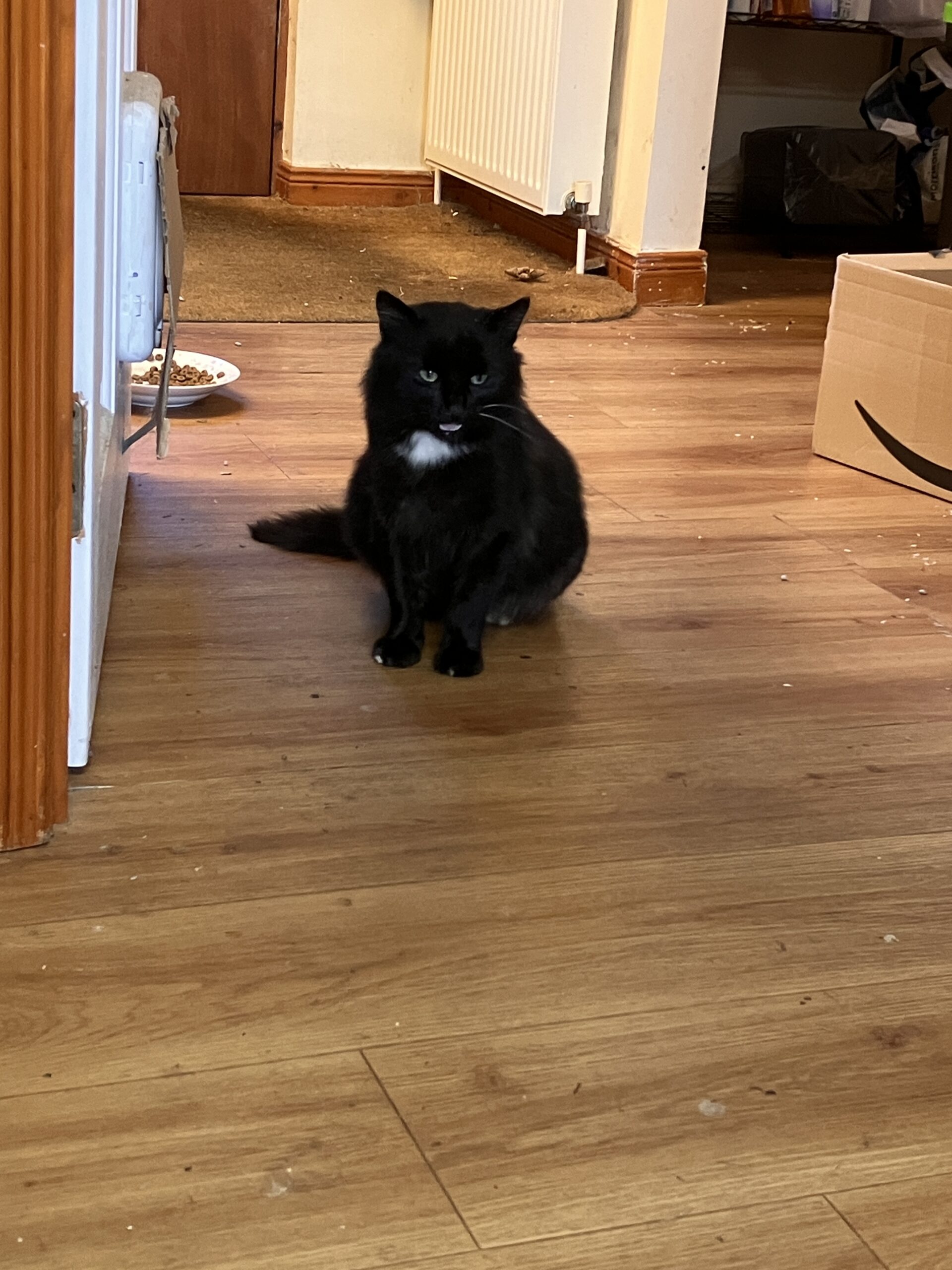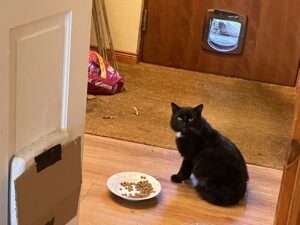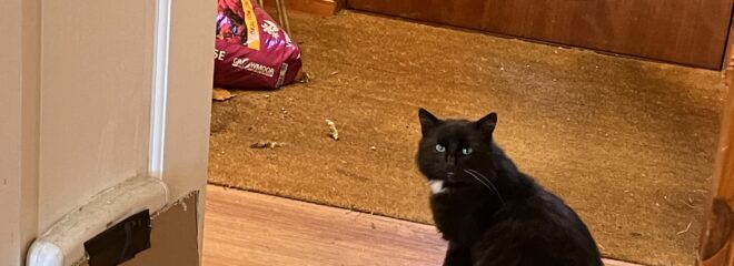 Our little “stray” Lucky is now coming indoors. She has had her flea and worm treatments in food and is now no longer scratching herself so yesterday we showed her the way in to the back of the house through the cat flap.