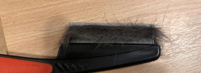 She just loves being combed, and every night, R spends a good ten minutes giving her the proverbial “good going over”. But no matter how often he combs her, more fur comes out – she seems to have an inexhaustible supply