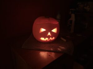 This is a pumpkin carved by me – not the world’s greatest attempt, but not bad considering that due to my dodgy right shoulder, I did the carving with my left hand.