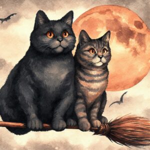 I also produced a picture of Saphy and Amber on their witch’s broom – courtesy of Bing AI.