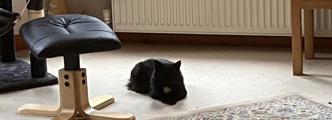 Then Saphy went out and caught a chaffinch. Sensing that I would be cleaning the house today as it is my birthday tomorrow and we have visitors, she very kindly brought it into the lounge and played at tossing it around for a while, strewing feathers everywhere. Virtually our whole house has wood floors which are easy to clear up – the lounge has a cream carpet which isn’t.