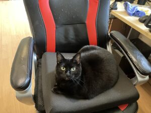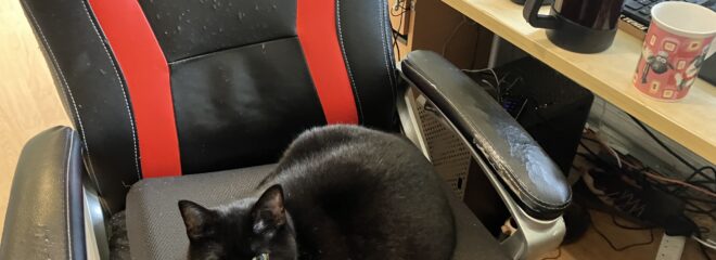 I went for an out-of-band cup of coffee while R was out. Came back two minutes later, and Amber had decided that the extra caffeine would not be good for me – so she blocked access to my office chair. My poor mother has still not met Amber because she (Amber not my mum) runs away the moment anyone apart from R, J and I enters the house. With people she knows, Amber is a lovely friendly cat – although an enormous chonk.